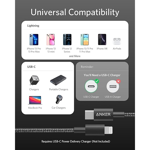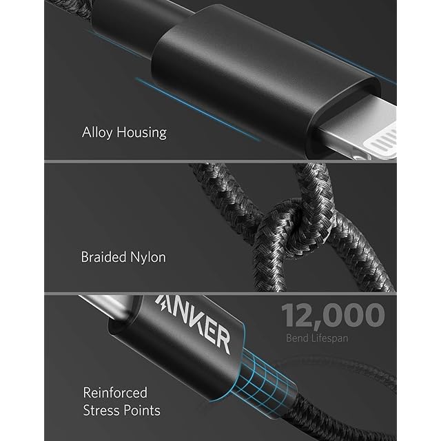 Anker 高耐久ナイロンUSB-C & ライトニング ケーブル<br> 高耐久、高品質のiPhone充電ケーブル<br><br> iPhoneにもフルスピード充電を:<br> USB Power Delivery対応のUSB-C急速充電器と一緒に使用することで、iPhone 11 Pro を含む最新のiPhoneへフルスピード充電が可能です。<br><br> Apple MFi認証<br> Apple社に許可を受けた証であるMFi認証を取得しており、安心してご使用頂けます。 iPhoneやiPad、iPod、その他のLightning端子機器に対して最適に動作するよう設計されています。 <br><br> 優れた耐久性<br>二重に編み込まれた高耐久ナイロンに加え、様々な加工や保護技術を駆使してケーブルの耐久性を追求。12,000回以上の厳しい折り曲げテストをクリアし、一般的なケーブルより12倍以上の耐久性を実現しました。<br><br>主な対応機種<br>iPhone 11 / 11 Pro / 11 Pro Max / SE(第2世代) / XS / XS Max / XR / X / 8 / 8 Plus / 7 / 7 Plus / 6s / 6s Plus / 6 / 6 Plus / SE(第1世代) / 5s / 5<br>iPad Air / Air 2<br>iPad mini / mini 2 / mini 3 / mini 4 / iPad (第4世代)<br>AirPods Pro / AirPods / AirPods with Wireless Charging Case<br>iPod nano (第7世代) and iPod touch (第5世代)
