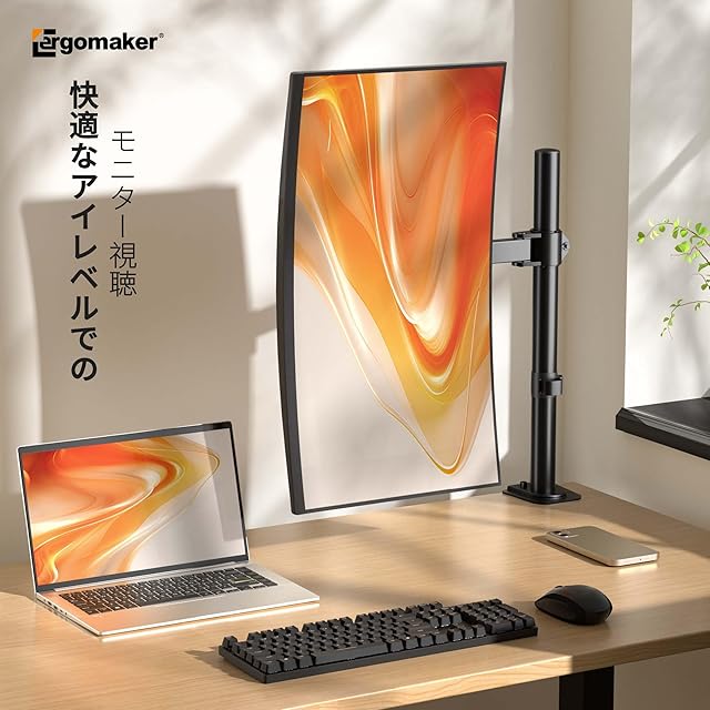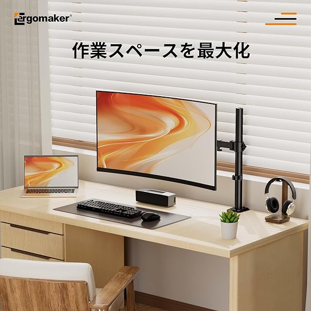 スペース節約:ディスプレイをアームに取り付けることで、デスクトップから浮かせることができ、他の作業やアイテムのためにスペースを確保することができます。これにより、デスクトップが整然とし、より大きな作業スペースが確保されます。