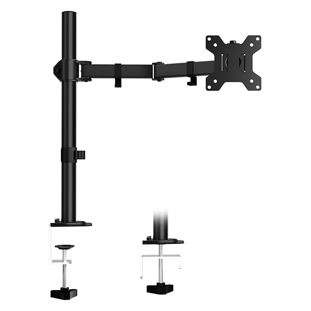 製品仕様:対応モニターサイズ:13~27インチ X 1台 、本体の高さ:42.5CM アーム長さ:43CM、耐荷重:8KG VESAサイズ:7.5CM*7.5CMと10CM*10CM