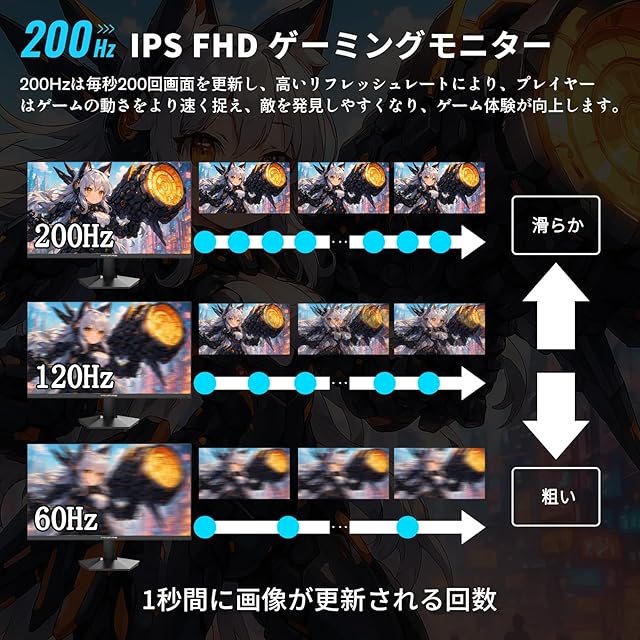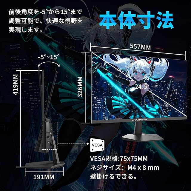 商品名:Minifire ゲーミングモニター 24.5インチ HDMI2つ 200Hz /180Hz /165Hz/144Hz/120Hz対応 120%sRGB広色域 320nit高輝度 1ms応答 1080p 非光沢IPSパネル VESA対応 角度調整 HDMI2.0 DP1.4 低ブルーライト, フリッカーフリースピーカー内蔵 五年付き MFG25X1
