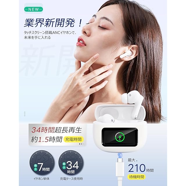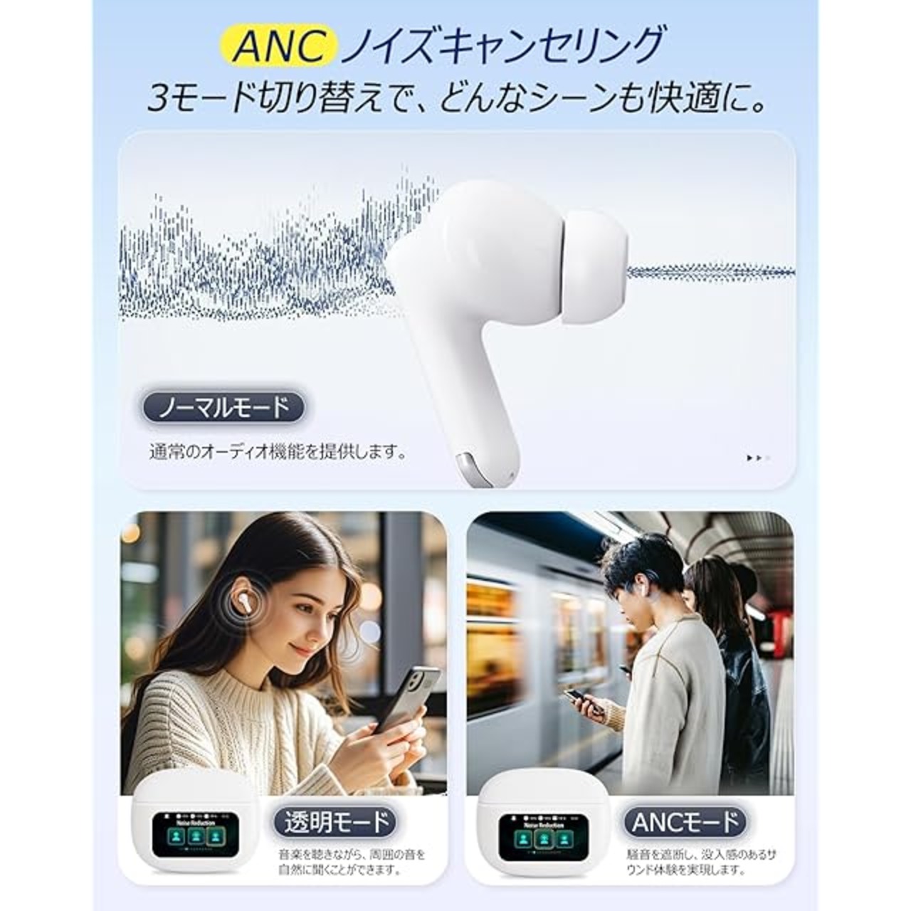 商品名:イヤホン bluetooth ワイヤレスイヤホン【2025年Bluetooth6.0・ タッチスクリーン搭載】 ANC/ENCノイズキャンセリング 長時間時間再生 13mm大口径 自動ペアリング 軽量 通勤/通学/ジム/スポーツ/オンライン会議 リモート撮影可能 iPhone/Android対応 プレゼント/ギフト最適 (ホワイト)