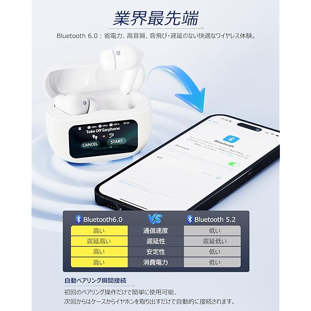 【超長時間再生 & 驚異の省電力設計】 ⏳イヤホン単体で最大7時間、充電ケースを使用すれば合計34時間の連続再生が可能! さらに、わずか1.5時間の充電でフル充電できるため、急な外出前でも安心です。⚡ 待機時間は最大210時間と、長期間使用しない場合でも電池切れの心配がありません。 Bluetooth 6.0の省電力技術により、従来のワイヤレスイヤホンよりも電池持ちが向上!充電ケースのLED画面で残量を確認できるため、突然の電池切れを防ぎます。
