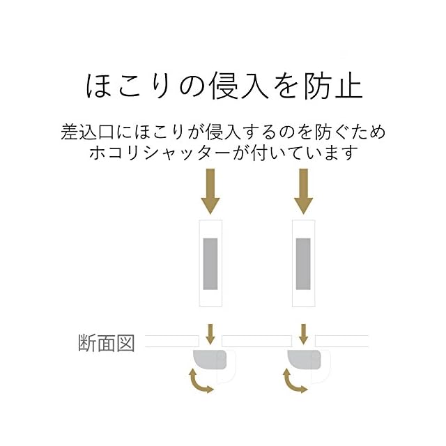 未使用の差込口にホコリが侵入するのを防ぐために、の差込口にホコリシャッターがついています。差込口からプラグを抜くとシャッターが閉まり、ホコリの浸入を防止します。