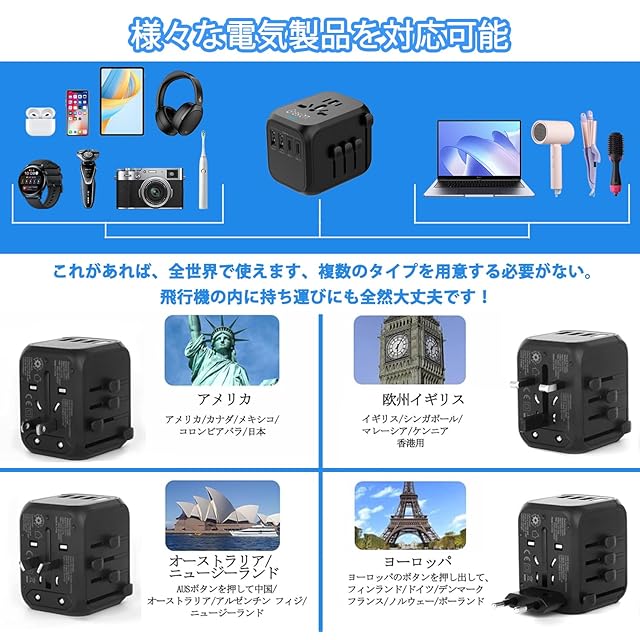 【持ち運びやすい&海外旅行や出張に便利】トラベル用変換プラグアダプターの本体は一体型のデザインなので、非常に軽くてかさばらず、コンパクトに持ち運びでき、使いやすいのが魅力です。組み立て型のようにバラバラになりません。飛行機の内に持ち運びにも全然大丈夫です。この一台があれば、主要などの国へ行ってもスムーズに充電可能です。国に合わせて相応のプラグを押し出して、コンセントやソケットに接続するだけで完成。使い方は非常に簡単です。使用しない時は付属の収納ケースに入れて、邪魔になりません。収納が大変、紛失しやすい等のお困りがありません、コスパ最高です。海外旅行、出張、研修など海外に行く機会が多い方に最適です。