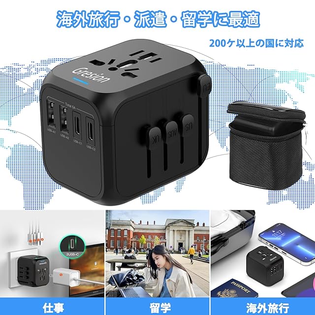 商品名:変換プラグ Gresion 変圧器 海外旅行 マルチ変換プラグ 旅行 便利グッズ トラベル コンセント 出張 旅行充電器 韓国 台湾 アメリカ シンガポール オーストラリア イギリス全世界対応 A O BF Cタイプ 100V-250V/8A USB-A 2ポートとType-C 2ポート搭載