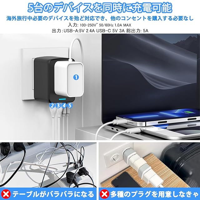 【4ポート搭載&Type C急速充電】こちらの変換プラグは2つのUSB-Aと2つのType-Cポートが搭載しております。この1つで同時に5台のデバイスを使用できですごく便利です。iPhone、Androidスマホ、スマートウォッチ、イヤホン、パソコンやデジタルカメラなど、USBを多く使うなら、USBポート付きのこちらの変換プラグも選択肢に入るでしょう!尚、マルチ変換プラグのType-Cポートで充電の場合、最大出力5V*3A=15W対応で、ハイパワー急速充電が可能になります。デバイスの電池容量が小さいまたは充電を忘れしやすい方にお勧めです。