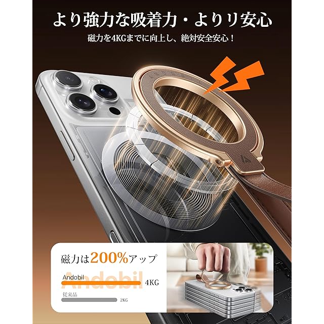【吸着力4KG・より強力な磁力、より高い安心感】スマホの安全性もAndobilが重視しています。Andobilのプロダクトマネージャーは、磁力をより強化することで、お客様が使用する際の安心感を向上させることを考えました。数百回の実験の結果、この小型のマグセーフ リングに4kgの磁力を実現しました。まず、MagStand Proでは磁石の中でも最も強力な「N56ネオジム」を使用しています。さらに、製品内部の磁石の配置を最適化し、この小さなバンカーリングに最大24個の磁石を収めることに成功しました。最後に、製品の背面にはシリコンを追加し、摩擦力と吸着力を強化するだけでなく、携帯リングを使用する際にスマホが傷つけられる心配がないため、快適にご利用いただけます。また、MagSafe対応のケースであれば、iPhone 16/15/14/13/12シリーズでもケースをつけたまま使用できます。