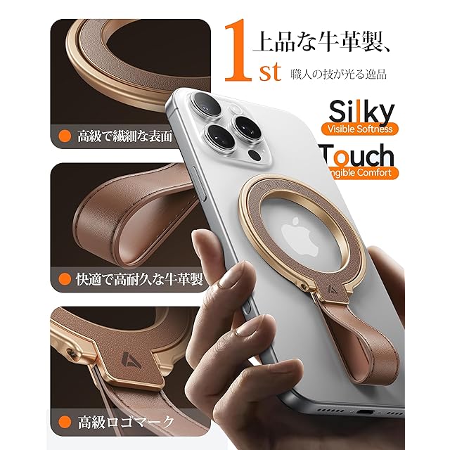 AndobilのMagStand Proは、次のような卓越した特徴を備えたスマホリングです: ①多角度調整可能: MagStand Proは、0°から90°まで無段階に角度を調整でき、快適な視聴や操作が可能です。 ②堅牢な構造:MagStand Proは高品質な素材で作られており、スマホを安定して保持し、長期間の使用にも耐えます。③強力な磁力: MagStand Proは24個のN56磁石を搭載し、磁力が最大4KGまであり、スマホ落下の心配がありません。 ④至高の牛革素材: MagStand Proは厳選された至高のフルグレインレザーを採用して、高級感あふれる外観と繊細な触り心地、そして長持ちする耐久性を兼ね備えています。 ⑤.両面磁力機能:MagStand Proは両面磁力機能を搭載しており、magsafe式車載ホルダーや冷蔵庫、キッチン壁面など、あらゆる磁性体表面に吸着してご利用いただけます。MagStand Proはのこれらの特徴により、より快適で便利、安全で安心な生活をお楽しみいただけます。