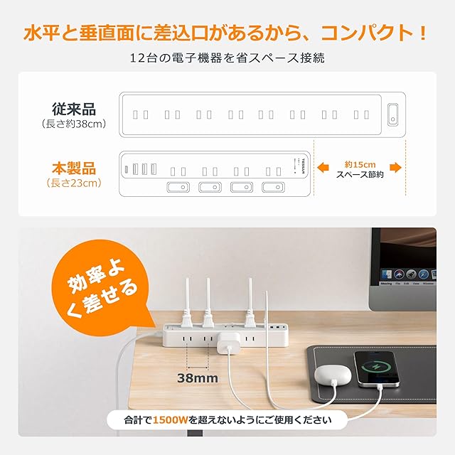 これは8個のac差込口、3個のusb-aポート、1個のusb-cポートを搭載しているusb コンセントです。これ1つのAC タップで、12台の機器を同時に充電できます。また、45°角薄型プラグと 2 メートルのコード設計により、狭い隙間にも簡単に設置可能です。家具の後ろや壁際でも、スペースを有効に活用できるため、見た目もすっきりします。常時電源と独立したスイッチを備えた AC コンセントにより、エネルギーと節電が非常に簡単になります。耐熱ABS安全材料で作られて、お客様に安全便利さを提供します。合計最大出力は1500Wで、さらに壁掛け用の取り付け穴が2つと滑り止めパッドが4つ付いているので、家中のさまざまな場所で使えます。