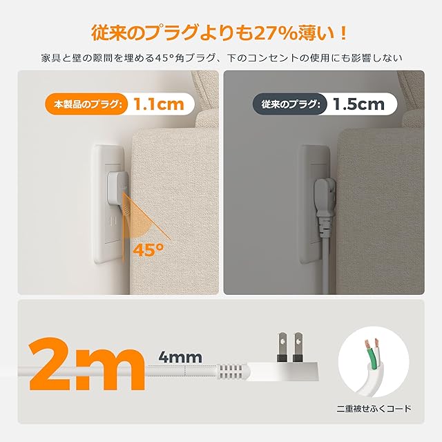 【電源タップ 薄型・コーナータップ】この延長コード 2m 薄型と薄型プラグの採用により、1.1cm の薄さを持ち、壁面にぴったりと密着します。45°の傾斜設計のL型プラグにより、下のコンセントを邪魔せず利用できます。薄型設計を採用したこのデザインは、家具の後ろや狭い隙間にもスムーズに挿入可能です。コンパクトで収納しやすく、使いやすい設計なので、ご家庭やオフィスでの日常使用に最適です。