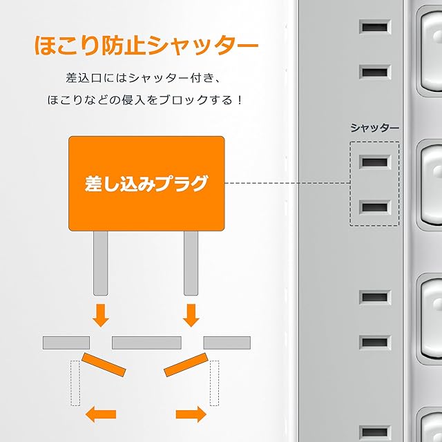 【ほこりシャッター・雷ガードタップ】このケーブルタップは雷ガード機能も装備されており、内蔵されたサージ吸収素子(バリスタ)が雷サージを吸収し、接続機器を守ります。このコンセント タップの差込口に「ほこり防止シャッター」を搭載した、未使用時の差込口へのほこりの浸入を防止する、トラッキング現象による火災やお子様のいたずらによる感電・火災の防止に役立ちます。