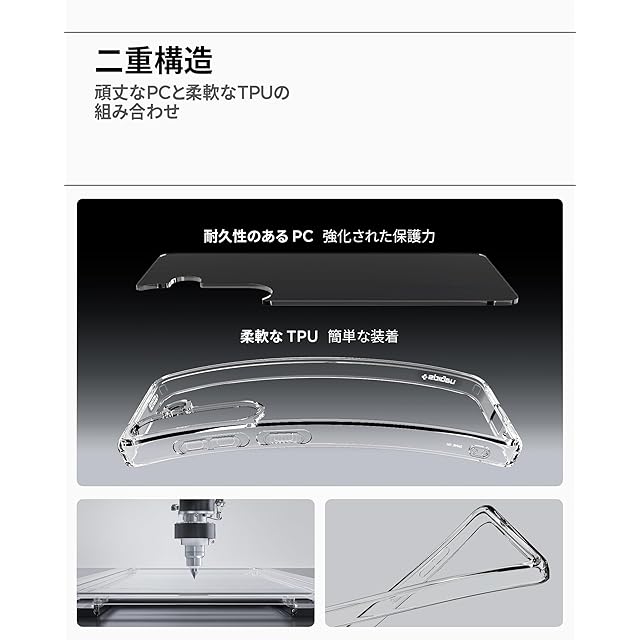 【透明さを守り抜く】黄変を抑制する特殊素材を採用しており、黄変を防ぎます。TPU(熱可塑性ポリウレタン)には補色を応用し作り上げられた『デュラクリア』が使用され、黄変を最小限に抑制しました。