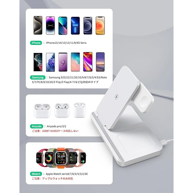 【対応する型番について】スマホ:iPhone16/15/14/13/12/11/X/XS/XR/8/SE/SUMSUNG/HUAWEIなどのワイヤレス充電対応する全ての型番。イヤホン:ワイヤレス充電対応する全てのイヤホン。【ご注意】:airpodsの場合、magsafe充電ケースが対応するが、Lightning充電ケースが対応しない。※ スマートウォッチはiWatchのみ対応。