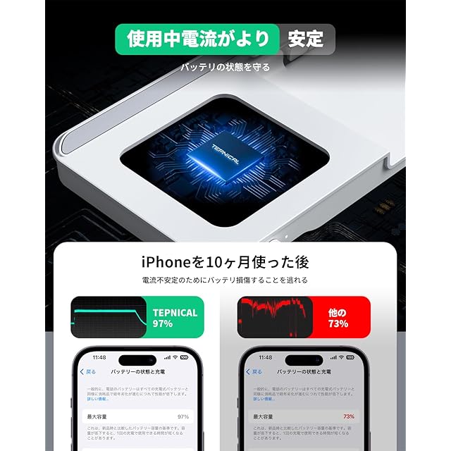【3台1役、かつてない充電効率】充電速度と効率をさらに高めるために、今回のT13はQCアダプタではなくコストがより高い20W PDアダプタを付属にしました(今まで弊社だけ)。QCの方と比べて、PDアダプタは革新的にCCピン足を使用して電流転換をシンプル化し、充電効率を高めました。