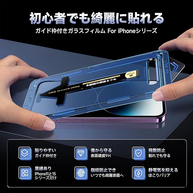 【もう失敗はしない】本製品はiPhone14 Proに対応するプライバシーフィルム2枚セットです。百万以上の欧米ユーザーのフィドバックを集めて日々改善したガイド枠は、3歩だけで保護フィルムを貼り付けます。そのうえ、自動ホコリ取りデザインだけでなく、ガイド枠のスロープデザインで、空気を順序に取り除くことができて、初心者でも気泡レスのまま綺麗に貼れます。