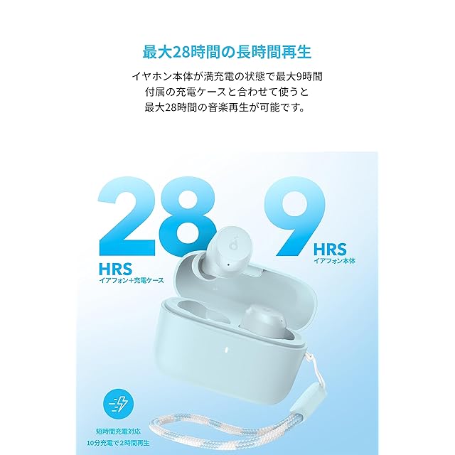 最大28時間長時間再生:イヤホン本体が満充電の状態で最大9時間、付属の充電ケースを合わせて使うと、最大28時間の音楽再生が可能です。また10分間の充電で約2時間分の音楽再生が可能です。