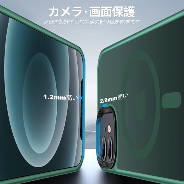 アイホン12/12 Proの曲線に従って高低差を設計。液晶画面より1.2mm高く、カメラレンズより2.9mm高く、机などの平面に置いても傷付く心配はない。※本製品は6.1インチしか対応できないですから、ご購入する前サイズを確認ください。