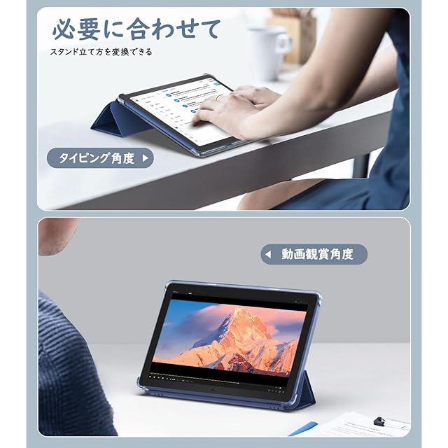 「便利なスタンド仕様」 フラップ部分には折り目が2ヶ所設けられており、折り曲がると手軽にスタンドに立てかける仕様より、タイピングや動画視聴などの2つの角度をご必要に応じてに使い分けられて、両手解放で動画鑑賞を楽々に楽しめ、仕事やゲームなどにもより快適に進められます。