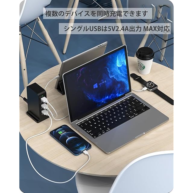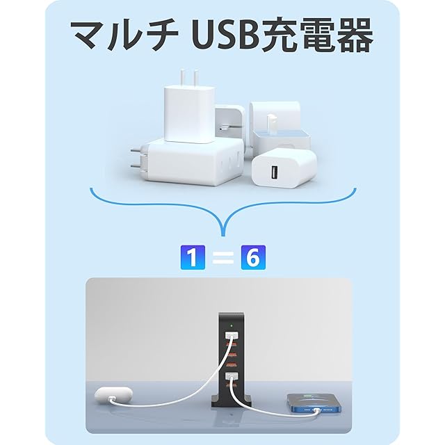 【USB充電器】USB6ポート充電器の設計で、同時に6台のUSBデバイスの充電に対応します。USB充電器は「Smart USB System」出力自働判別机能を搭載し、適切な電流を自働でマッチングし、1ポートあたり最大2.4A、合計10Aを出力します。