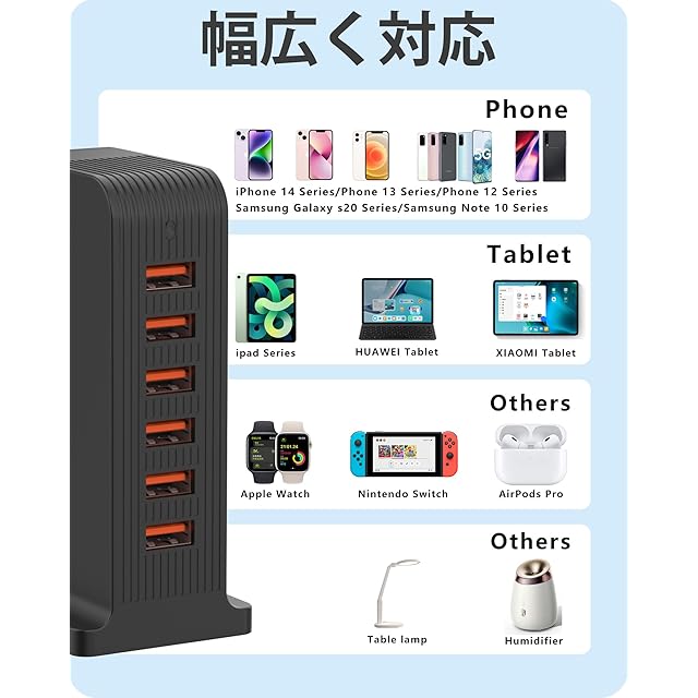 VHBW USB コンセント 5V 10A 50W USB 充電器 6ポート タワー式 電源 タップ<br><br><b>製品詳細</b><br><br><b>入力:</b> 100V〜240V 50 / 60Hz <br> <br><b>出力:</b> 5V 10A 50W <br> <br><b>ポート:</b> 6ポート<br> <br><b>コードの長さ:</b>150cm<br> <br><b>色:黒</b> <br> <br>USB コンセントは複数のデバイスと互換性がありますが、あなたは宝物を充電、携帯電話、タブレット、Bluetoothヘッドセットを充電することができます。<br> <br>安全性能</b><br><br><b>OVP: </b>過圧保護<br><br><b>OCP: </b>過電流保護<br><br><b>SCP: </b>短絡保護<br><br><b>OTP: </b>過熱保護<br><br><b>この製品はPSE認証に合格しており、その安全性能がされています。</b><br><br> <b>警告!</b><br><br>ACアダプタ一の誤使用は、火災ゃ態電など重大な事故の原因となります。<br><br>下記にご注意ください。<br><br>1. 感電注意。ぬれた手でACアダプタ一を触らないでください。 <br><br>2. 分解や改造をしないでください。<br><br>3. 使用後必ずACアダプタ一をコンセントから抜いてください。<br><br>4. 落 と す 、踏 み つ け る な ど 、強 い衝 撃 を 与 え な い で く だ さ い 。<br><br> <b>弊社製品の優勢:<br><br></b> 高品質の素材,弊社ちは高品質の素材を使用して、高品質の製品を製造し、お客様に提供します。すべての素材は慎重に選択されています。<br><br>家族みんなんで気軽にシェアします。 会社・オフィスにも活用できます。6人同時使用可能です。<br><br> 弊社すべての製品にはご注文日から12ヵ月の品質、および専用のカスタマーサービスによる迅速な対応を提供します。 従って、当社の製品に関するご質問やご提案がございましたら、いつでもご連絡ください。24時間以内にメッセージに返信いたします。