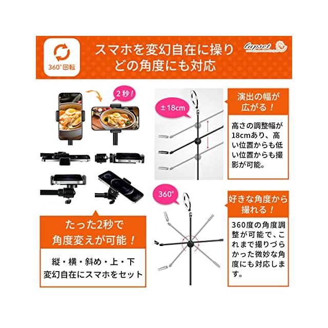 ✅【どんな角度にも調整可能】360度の角度調整が可能で、たったの2秒で横、縦、斜め、上下、変幻自在に好きな位置にスマホをセットできます。照明ライトの角度も自由に調整できるので、撮影時にスマホへの映り方を調整しながら撮影することができます。