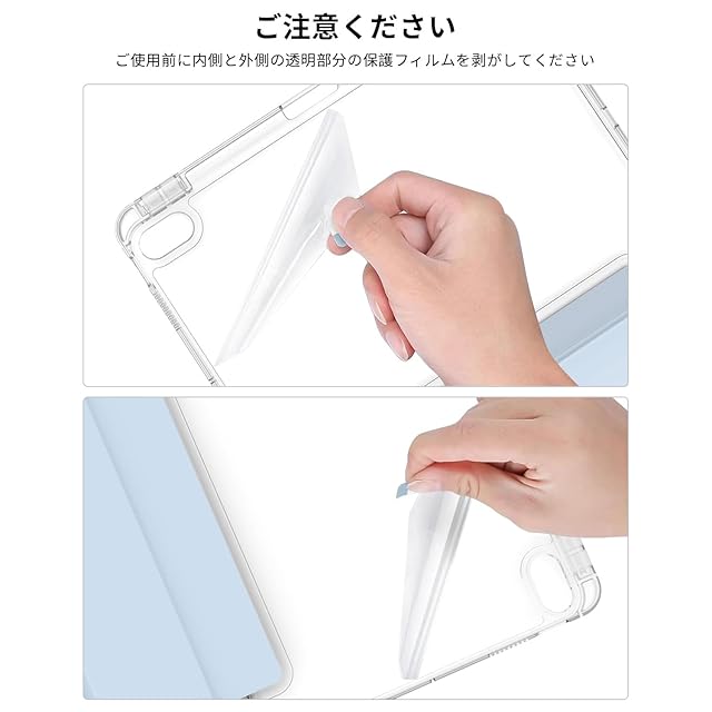 【透明な背面カバー】表面はPUレザー素材で作られ、裏面は透明なアクリル素材で作られ、デバイス自体の美しさを見せます。フレームには衝撃に強い柔軟なTPUを採用し、軽量かつ極薄で、四隅にクッション性のあるソフトフ、落下によるダメージを防ぎます。 (注意: 透明バックカバーの内側と外側に傷防止保護フィルムの層があります。使用前に保護フィルムを剥がしてください)