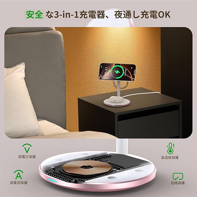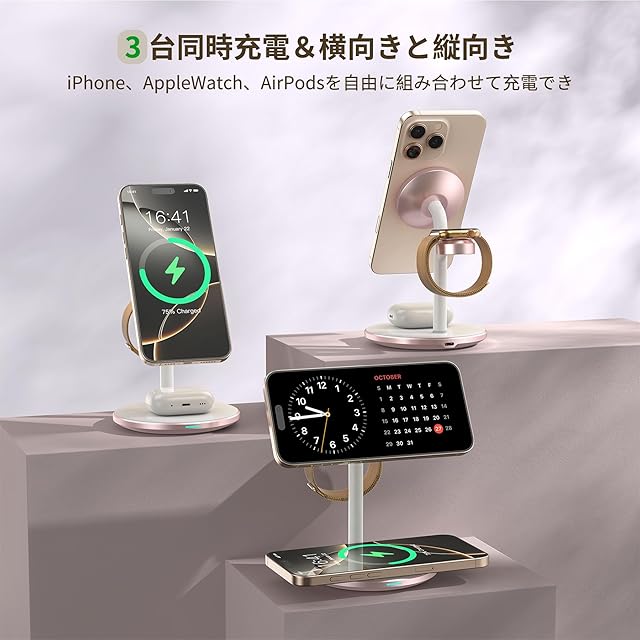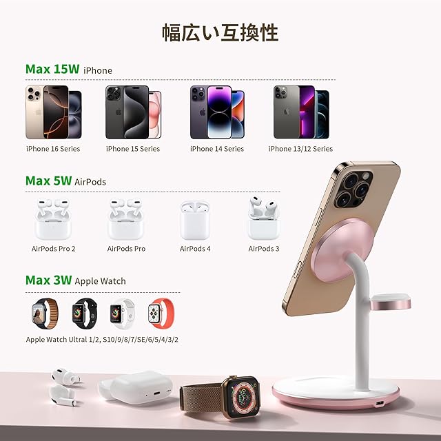 【3 in 1マグネット式ワイヤレス充電器スタンド】iPhone、Apple Watch、ワイヤレスイヤホンをこの1つのmagsafeワヤレス充電器だけで一度に充電できます。上部のmagsafeワイヤレス充電器はiPhone16 / 16 Plus/ 16 Pro/ 16 Pro Max、iPhone15 / 15 Plus/ 15 Pro/ 15 Pro Max、iPhone14 / 14 Plus/ 14 Pro/ 14 Pro Max、iPhone13 / 13mini/ 13 Pro/13 Pro Max、iPhone12 /12 mini/ Pro/12 Pro Max、MagSafeケースなどと互換性があります。Whatchワイヤレス充電器はApple Watch Ultra2 /Ultra /9 /8 /7 /SE /6 /5 /4 /3 /2 /1と互換性があります。台座のワイヤレス充電器はワイヤレスイヤホン3/2/Pro、ワイヤレス充電対応のスマホと互換性があります。ご注意:台座でのワイヤレス充電器の最大出力は5wです。