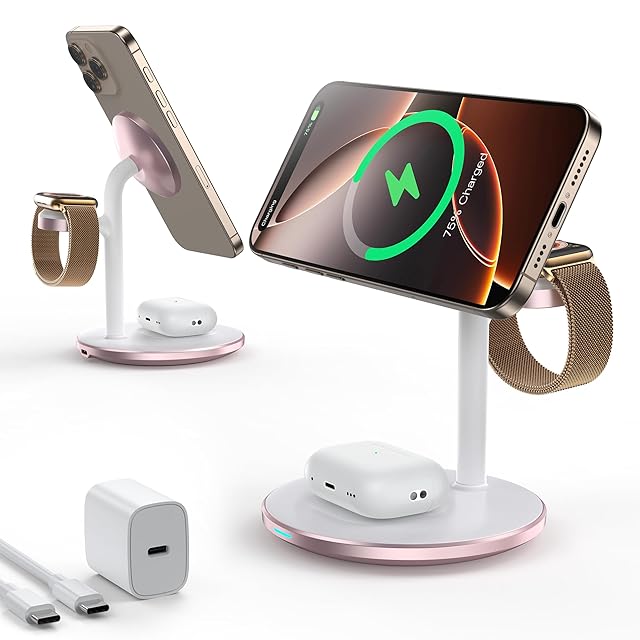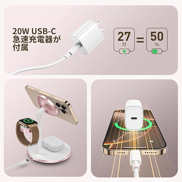 3in1 ワイヤレス充電器 マグネット式 マグセーフ充電器 スタンド 急速充電 Phone/Watch/ワイヤレスイヤホン同時充電 20W USB-Cアダプター付属 置くだけ充電 Phone 16 15 14 13 12 Pro Max/Plus/Pro/Mini,Watch Ultra2 /Ultra /9 /8/7/SE/6/5/4/3/2,ワイヤレスイヤホンに対応