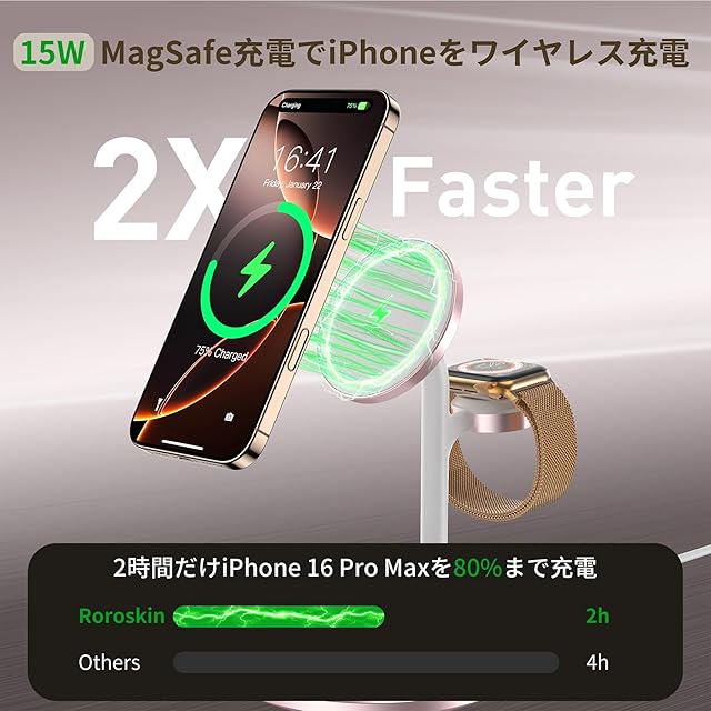 【パッケージ内容&18ヶ月期間】パッケージの内容:3 in 1マグネットワイヤレス充電器(アップルウォッチ、iphone16/15/14/ 13/ 12シリーズ、ワイヤレスイヤホン同時充電)、USB-C 20W PD 3.0充電器、 Type Cケーブル(1m )、説明書。PD 3.0 充電アダプターを付属するので、約30%速い速度で充電できます。有線で急速充電もできます。本製品は18ヶ月の期間を提供いたしますので、何か問題があるといつでもご連絡ください。弊社は返品いらずすぐ新しい商品を改めてします。