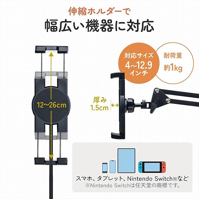 4~12.9インチまでに対応し、挟み込むことで固定できます。クランプ部は、縦・横挟みに対応し、厚さ0.5~7.5cmまで対応します。