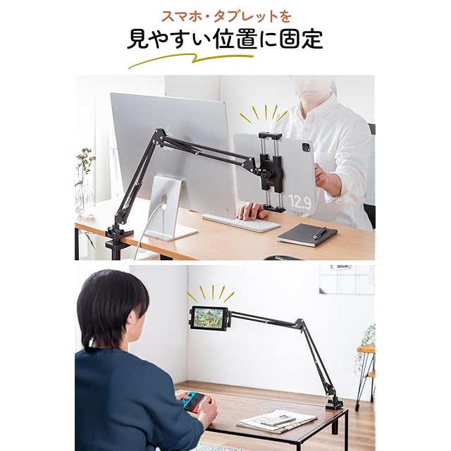 サンワダイレクト タブレット/スマホ対応 アームスタンド 寝ながら 360度回転 クランプ固定 耐荷重1kg 4~12.9インチ対応 ベッド タブレット 固定アーム 100-LATAB021