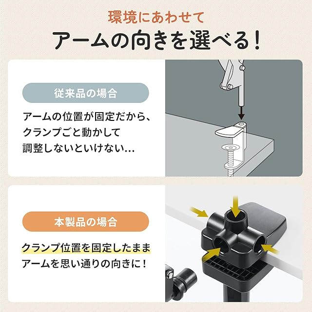 クランプ はアームの差し込み向きを上・横等にでき、 クランプ固定 したままアーム向きの変更ができます。