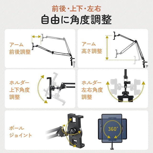 ホルダー部のボールジョイント、アームの4つの関節、アーム根元の 回転 でホルダーの位置や 向き を自在に 調節 できます。