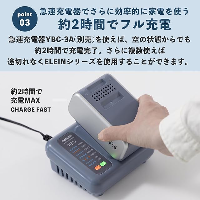 【約2時間で充電MAX】別売の急速充電器使用で、空の状態からでも約2時間で充電完了。さらに複数使えば途切れなくELEINシリーズを使用することができます。また、電源ボタンの隣に電池残量がひと目で分かるランプを搭載しているので、急な電池切れに備えることができます。