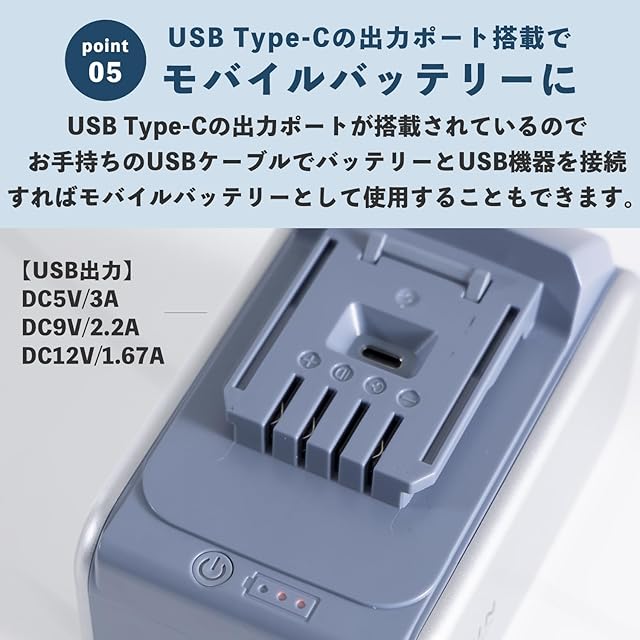 【モバイルバッテリーとして使う】USB Type-Cの出力ポートが搭載されているので、お手持ちのUSBケーブルで、バッテリーとUSB機器を接続すればモバイルバッテリーとして使用することもできます。バッテリーの電源ボタンを押すと、USB機器へ出力(給電)されます。