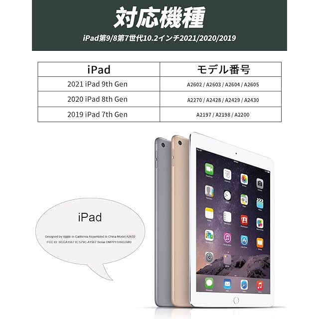 【対応機種】 iPad 10.2インチ 第9世代 2021(モデル番号:A2602/A2603/A2604/A2605)、iPad 10.2インチ 第8世代 2020 (モデル番号:A2270/A2428/A2429/A2430)、iPad 10.2インチ 第7世代 2019 (モデル番号:A2197 / A2198 / A2200) 専用スマートケース、カバー。(ご注意:iPadの他のモデルには対応していません、ご注文の際に、お手元機種の背面にあるモデル番号を確認をお願い致します。)
