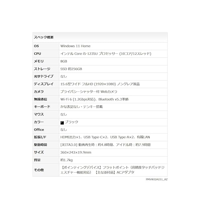 商品名:富士通 ノートパソコン FMV WA1/J2 (Win 11/15.6型/Core i5/8GB/SSD 256GB/Officeなし) AHシリーズ FMVWJ2A151_AZ