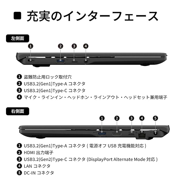 ディスプレイ:15.6型ワイド フルHD[1920×1080] ノングレア液晶 / 拡張I/F:HDMI出力×1、USB3.2(Gen2)Type-C×1(右側面(USB Power Delivery対応、DisplayPort Alt Mode対応))、USB3.2(Gen1)Type-C×1(左側面)、USB3.2(Gen1)Type-A×2(右側面×1(電源オフUSB充電機能付)、左側面×1) / 無線通信:Wi-Fi 6(1.2Gbps)対応、IEEE 802.11ax/ac/a/b/g/n準拠、MU-MIMO対応+Bluetooth v5.3準拠