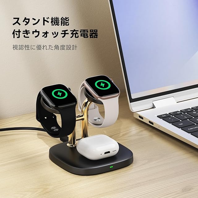 アップルウォッチ 充電器 スタンド 2台同時、Apple Watch対応 急速充電器、Apple Watch Ultra 2/Ultra/SE2/SE/10/9/8/7/6およびAirPods 4/Pro 2/Pro/3に対応、SwanScout 704A (黒+ゴールド)