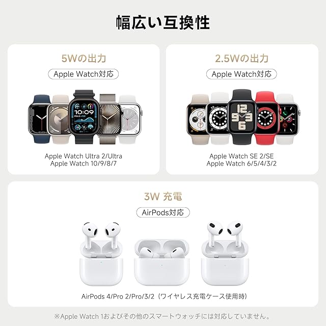 【幅広い互換性】Apple Watch Ultra 2/Ultra/SE 2/SE/10/9/8/7/6/5/4/3/2に対応。AirPods Pro/Pro 2/3/4(アクティブノイズキャンセリング搭載)などのワイヤレス充電対応イヤホンも充電可能。