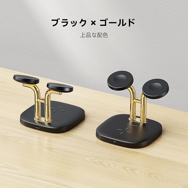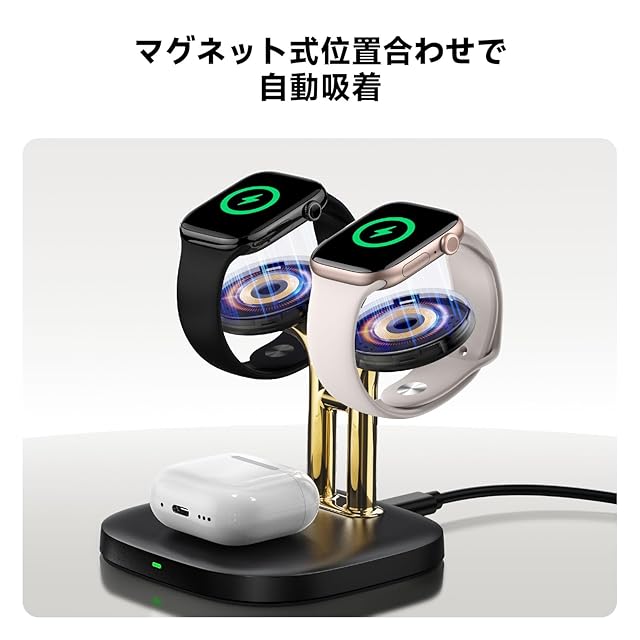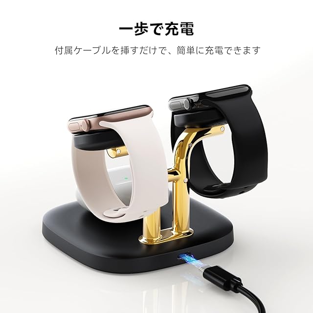 商品名:アップルウォッチ 充電器 スタンド 2台同時、Apple Watch対応 急速充電器、Apple Watch Ultra 2/Ultra/SE2/SE/10/9/8/7/6およびAirPods 4/Pro 2/Pro/3に対応、SwanScout 704A (黒+ゴールド)