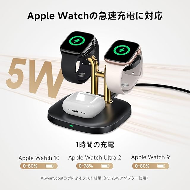 アップルウォッチ 充電器 スタンド 2台同時、iWatch対応 急速充電器、iWatch Ultra 2/Ultra/SE2/SE/10/9/8/7/6およびAirPods 4/Pro 2/Pro/3に対応、SwanScout 704A