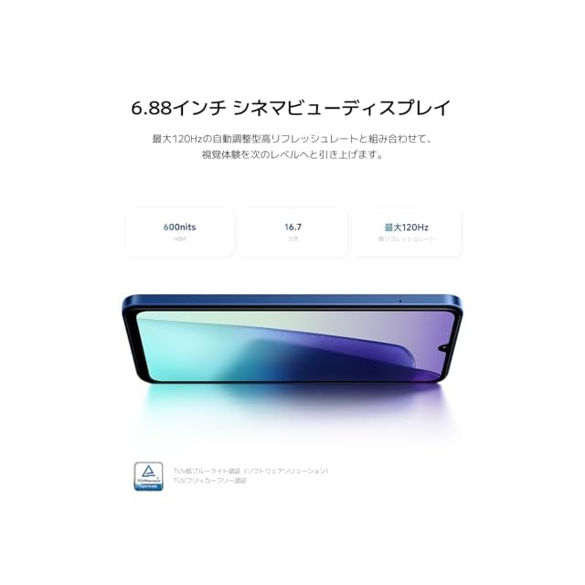 【没入感あふれる6.88インチディスプレイ】Redmiシリーズ初の6.88インチディスプレイを搭載し、お気に入りのコンテンツを映画館のような没入感のある視聴体験でお楽しみいただけます。最大120Hzの自動調整型高リフレッシュレートと組み合わせて、Redmi 14Cは視覚体験を次のレベルへと引き上げます。