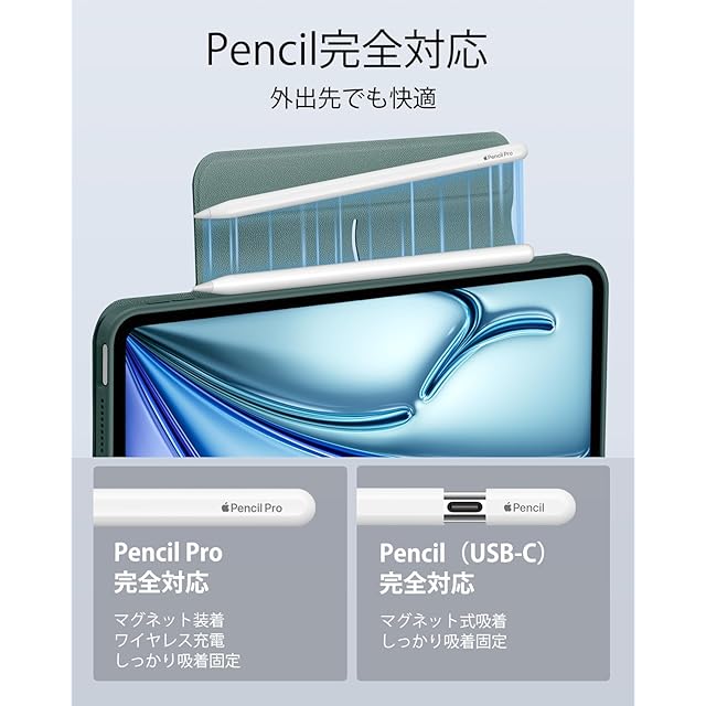 【Pencil Pro&Pencil (USB-C)対応】:Pencil Proへ完全対応かつ、磁気充電用の側面の溝と、Pencilをしっかりと固定するマグネットクラスプを備えています