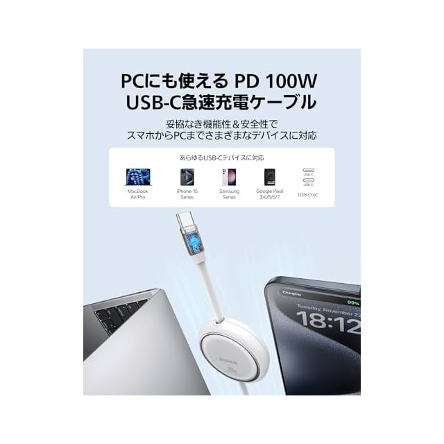 商品名:「VGP 2025受賞」Baseus 充電ケーブル 巻き取り式 USB-C ケーブル 急速充電 100W 5A PD対応 絡まない コンパクト リール式 iPhone16/15 Galaxy iPad Pro MacBook Pro 対応 Free2Draw 最大長さ1m ムーンホワイト