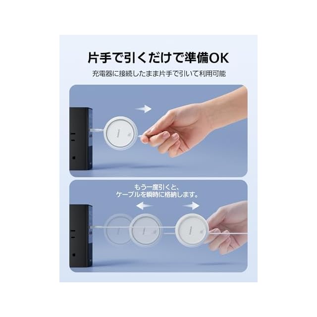 【完全巻き取り式・耐久性抜群】 巻き取り式のUSB-C充電ケーブルは、引っ張るだけで簡単に収納でき、スペースを節約。絡まりやすいケーブルや散らかりやすい充電環境とは無縁です。50,000回以上の引っ張りテストに耐える耐久性を実現。いつでも安定したパフォーマンスを提供し、ケーブル交換は長期間不要です。