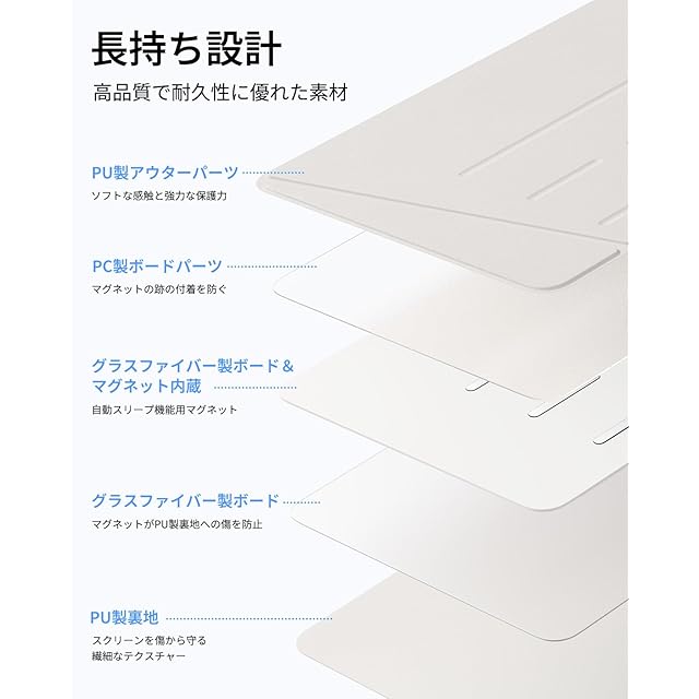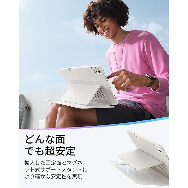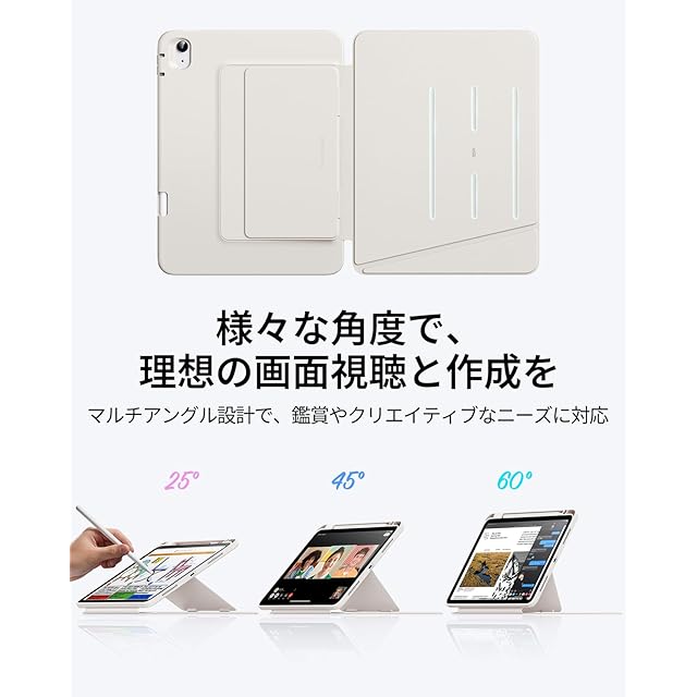 【マルチアングルデザイン】:2つのスタンドモードに対応しており、45°~60°はビデオ鑑賞、作業、FaceTimingなどに最適なビューイングモードへと、25°に調節した場合は執筆、絵画、その他のクリエイティブな作業に最適なライティングモードへと用途に合わせて角度調節が行えます
