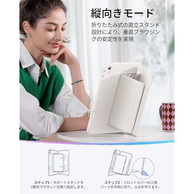 【縦横自在スタンド機能】:3段階調節可能な横向きモードと、独自開発の「三角ダブルロック構造」を採用した縦向きモードを備えています。動画視聴からSNS閲覧まで、磁石スタンドサポートによる固定デザインにより、確かな安定性を実現します。縦向き利用時は2番目のマグネット位置へ固定し、フロントカバーの小さな三角パーツを外側に折ることでしっかりと自立します(内側に広げて使用しないでください)。