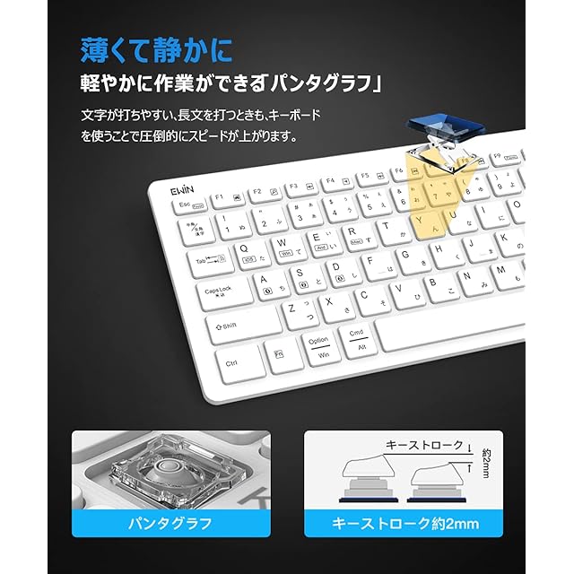 【薄型軽量ながら高い耐久性を実現】 サイズは29cm×12.5cm×1.8cm、重さ約290g、外枠がスリムな薄形コンパクト設計で持ち運びに最適です! さらに、300万回を超えるタイピングテストを行い、耐久性を実証します。薄型軽量ながら耐久性にも優れた薄型無線キーボードを実現します。 キータイプには、ノートパソコンのキーボードと同じ、軽い力で打鍵できる「パンタグラフ方式」を採用しています。