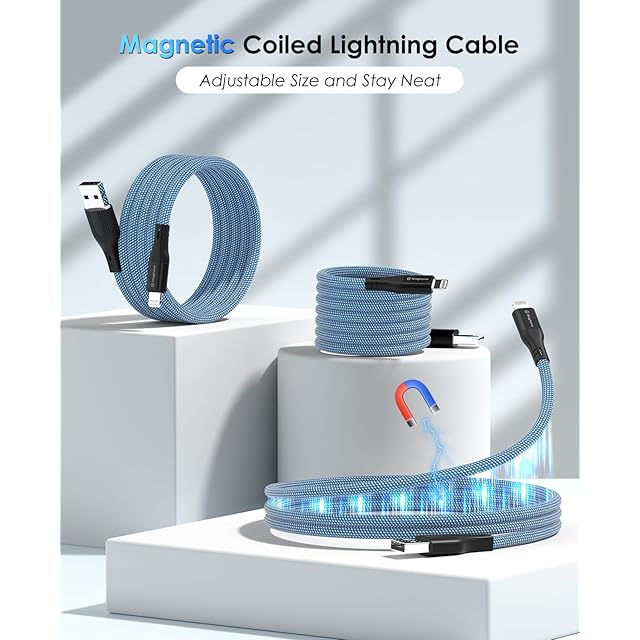 磁気コイル状5フィート ブルー USB A - ライトニングケーブル iPhone 高速充電用 <br><br>この磁気iPhone Lightningケーブルで充電体験に革命を起こしましょう。 利便性と効率性を追求して設計された高品質のMFiチップは、2.4Aの高速充電とUSB 2.0データ転送をサポートし、磁気機能により、ワークスペースを整頓して整理できます。 自宅、オフィス、外出先での使用に最適なこのケーブルは、機能性と洗練されたモダンな外観を兼ね備えています。 <br><br>【3色2種類の長さ】ブラック、シルバー、ブルーからお選びいただき、ニーズに合わせて3.3フィートまたは5フィートの長さを選択できます。 <br><br>【完全対応デバイス】iPhone 14 Plus / iPhone 14 / 14 Pro Max / iPhone 13 mini / 13 / 13 Pro / 13 Pro Max / iPhone 12 mini / 12 / 12 Pro / 12 Pro Max / 11 Pro Max / 11 Pro Max / XS / XS Max / XR / X / 8 / 8 Plus / iPhone SE。 <br><br>